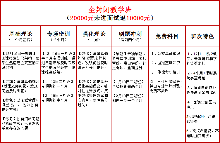 全封閉班是2+2的形式,2個(gè)月正常學(xué)理論,不包吃住,2個(gè)月包吃住,從早上8:30上課到晚上10點(diǎn),全天有老師。筆試進(jìn)入面試范圍不退費(fèi),如未進(jìn)入面試范圍留2個(gè)月的食宿,其余全退。學(xué)期到考試前三天。